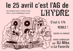 L’association Sorties de secours, l’asso qui gère l’Hydre, invite tous les adhérent.es à cette AG, et à la soirée conviviale qui suivra.